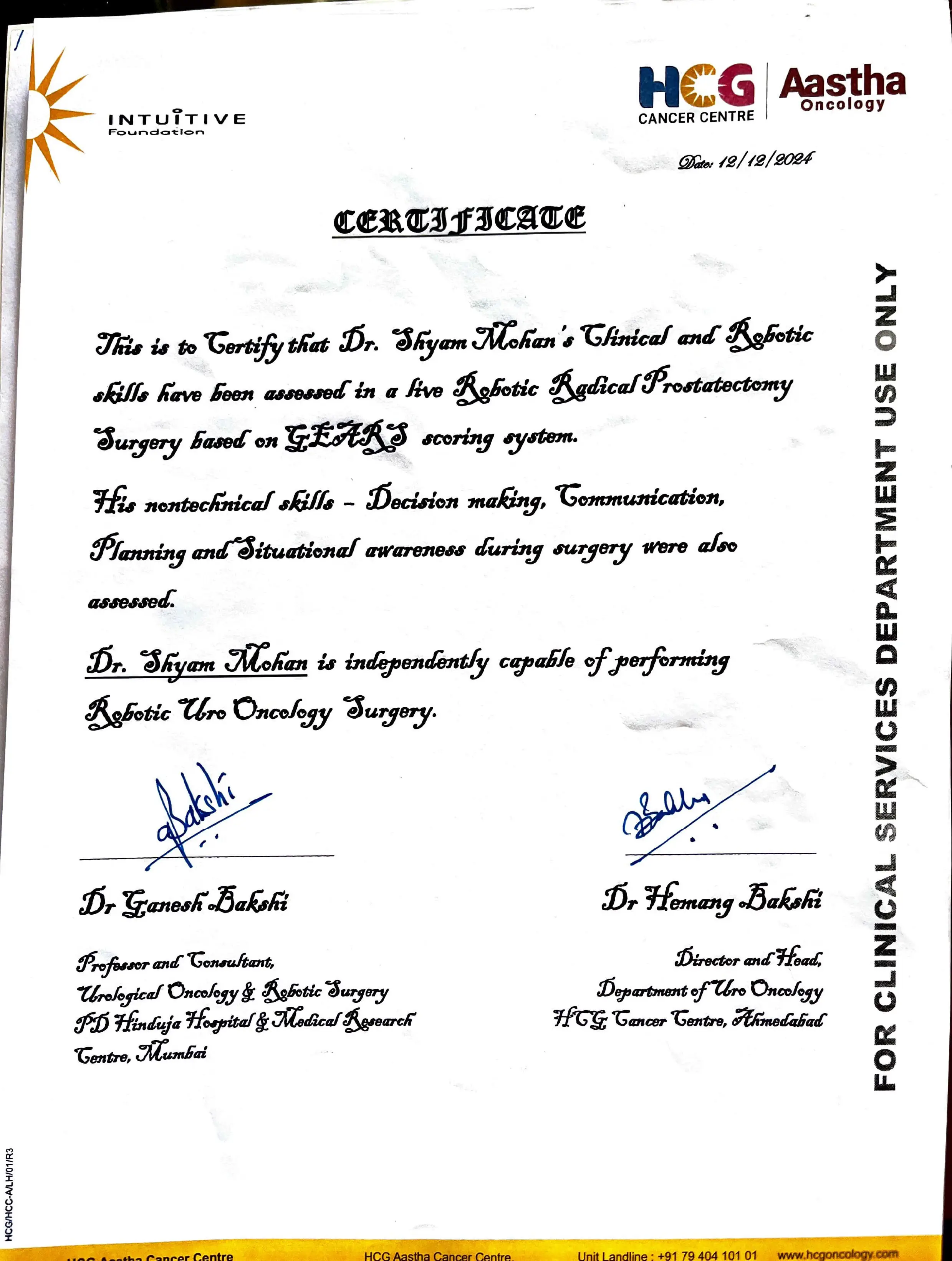 - Fellow in Advanced Robotic Uro Oncosurgery – HCG Cancer centre, Ahmedabad (2023-24)